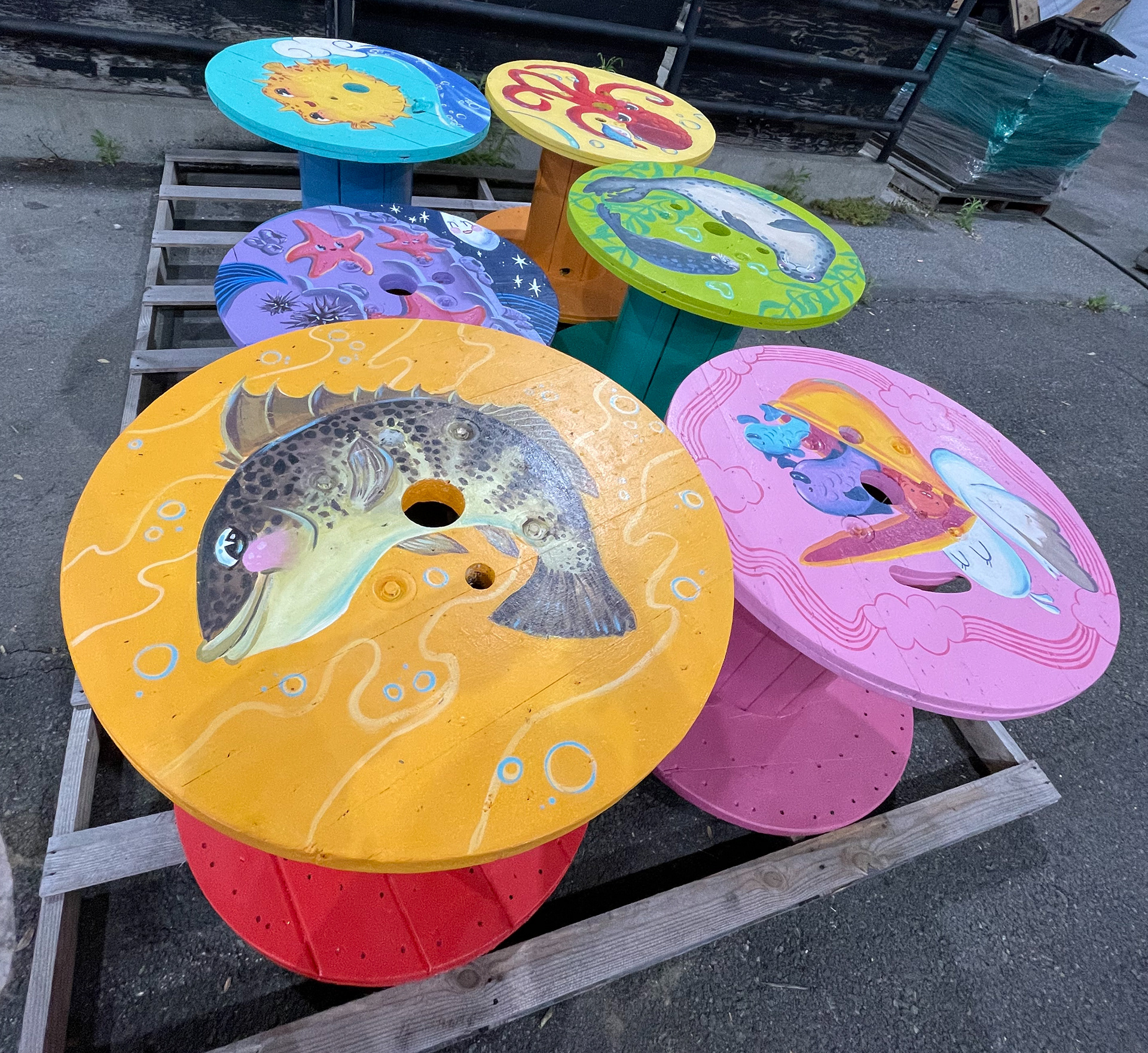 Designed, sketched and painted sea character tables for Orange County Fair, Costa Mesa, CA. 4 feet by 4 feet each. Paint on wood rustic tables. 2024.